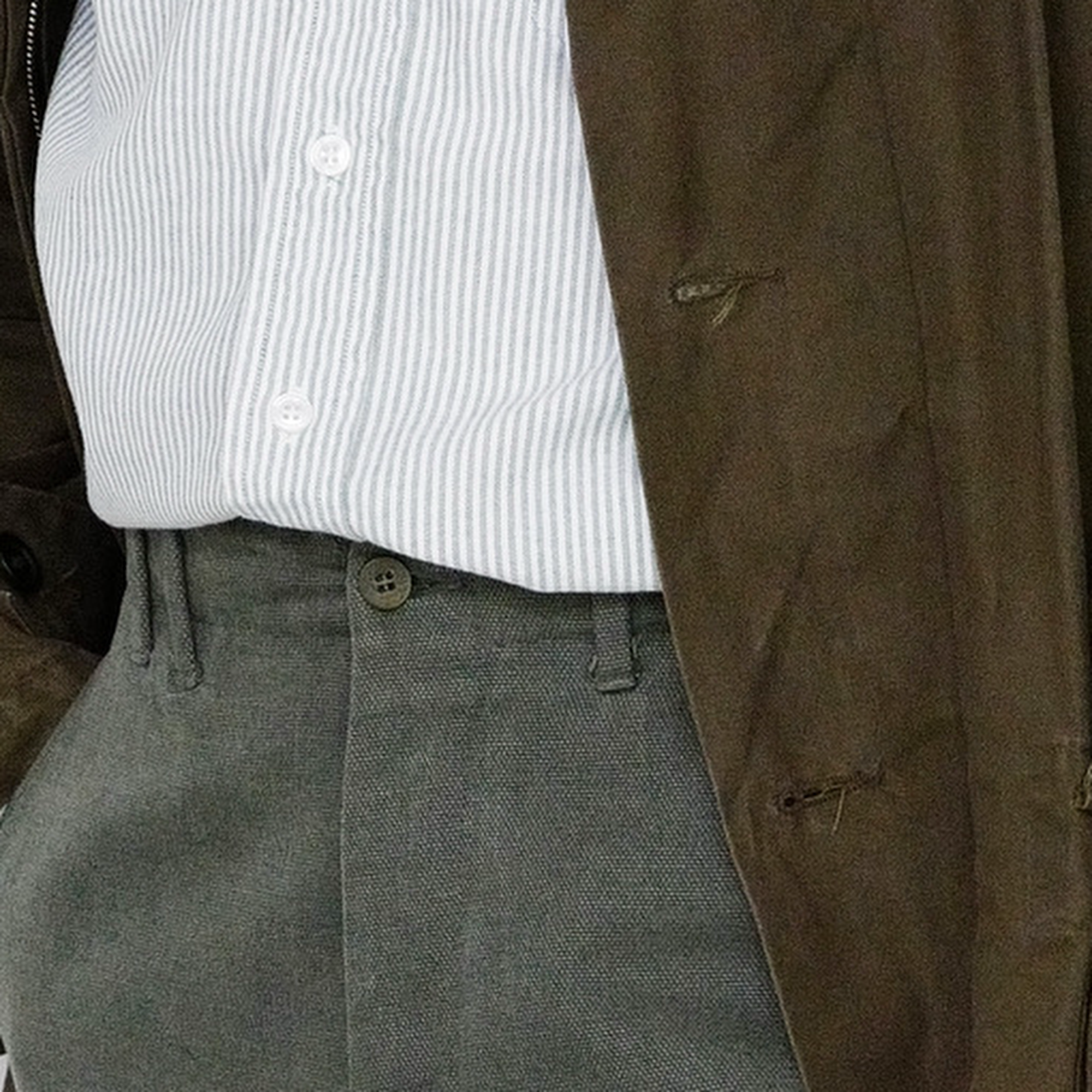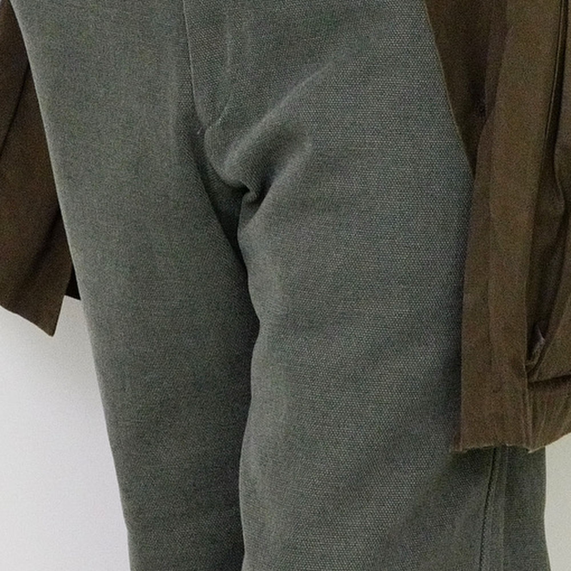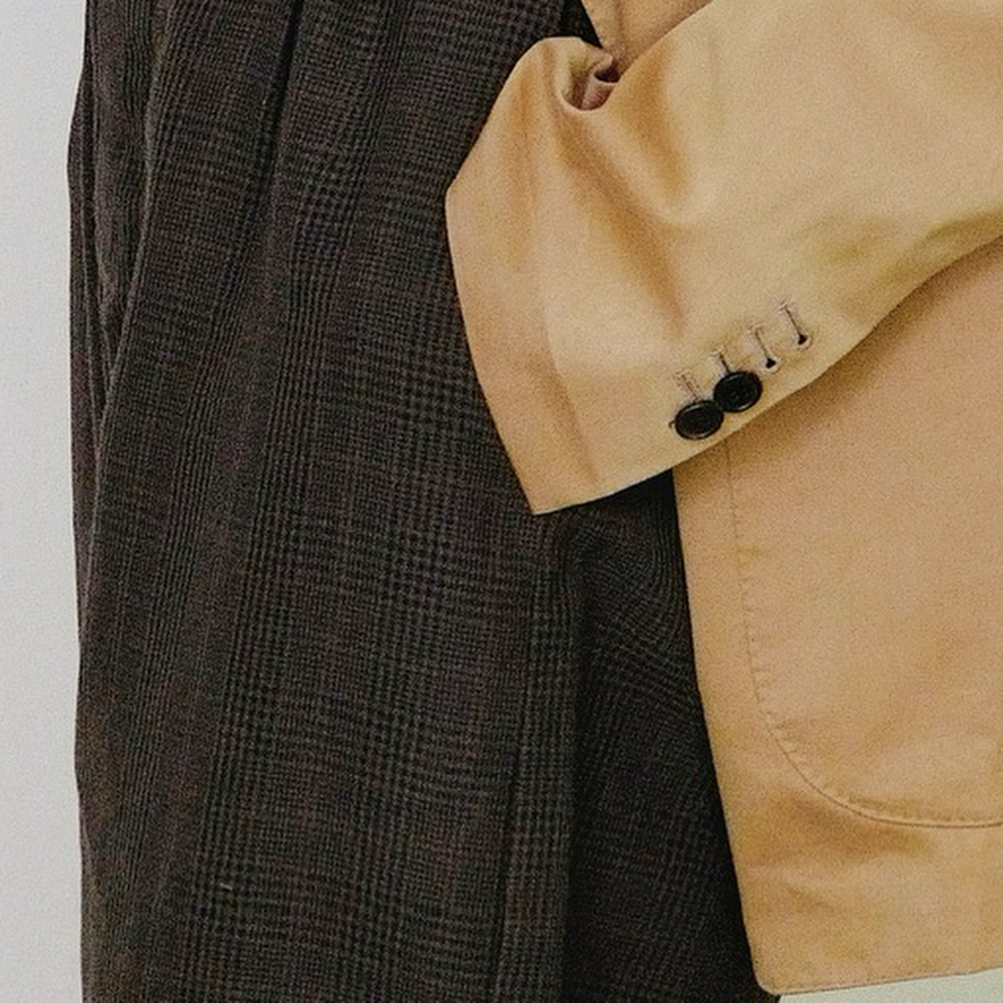 A high-waisted, slightly tapered trouser in a dark glen plaid cloth—woven in Japan from an uncommon blend of wool and paper. The result is both structured and dry to the touch, with a visual variation that rewards close inspection. Pleats at the waistband lend ease of movement, while the fit narrows gently through the leg. Details remain exacting: a button fly secured with U.S.-made hardware, reinforced by vegetable-tanned leather washers.